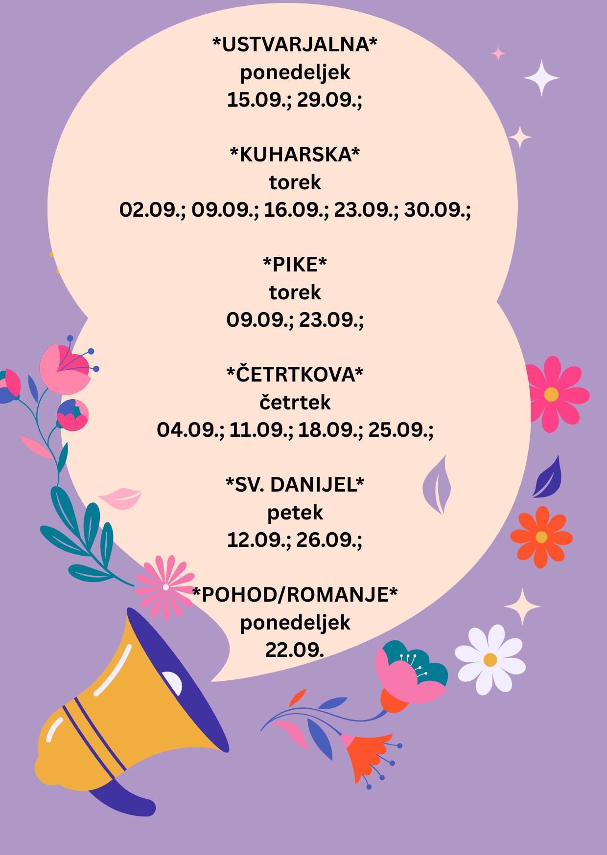 NAPOVEDNIK September bo potrkal na vrata. Narava si je nadela jesenske barve. Otroci bodo kmalu zasedli šolske klopi. Mi pa se bomo ponovno družili na naših srečanjih v okviru programa socialno vključevanje.Na vsa srečanja boste povabljeni preko sms obvestil. Veselimo se srečanja z vami. *Dejavnost razdeljevanja hrane in izvajanja spremljevalnih ukrepov je financirana Programa ESS+