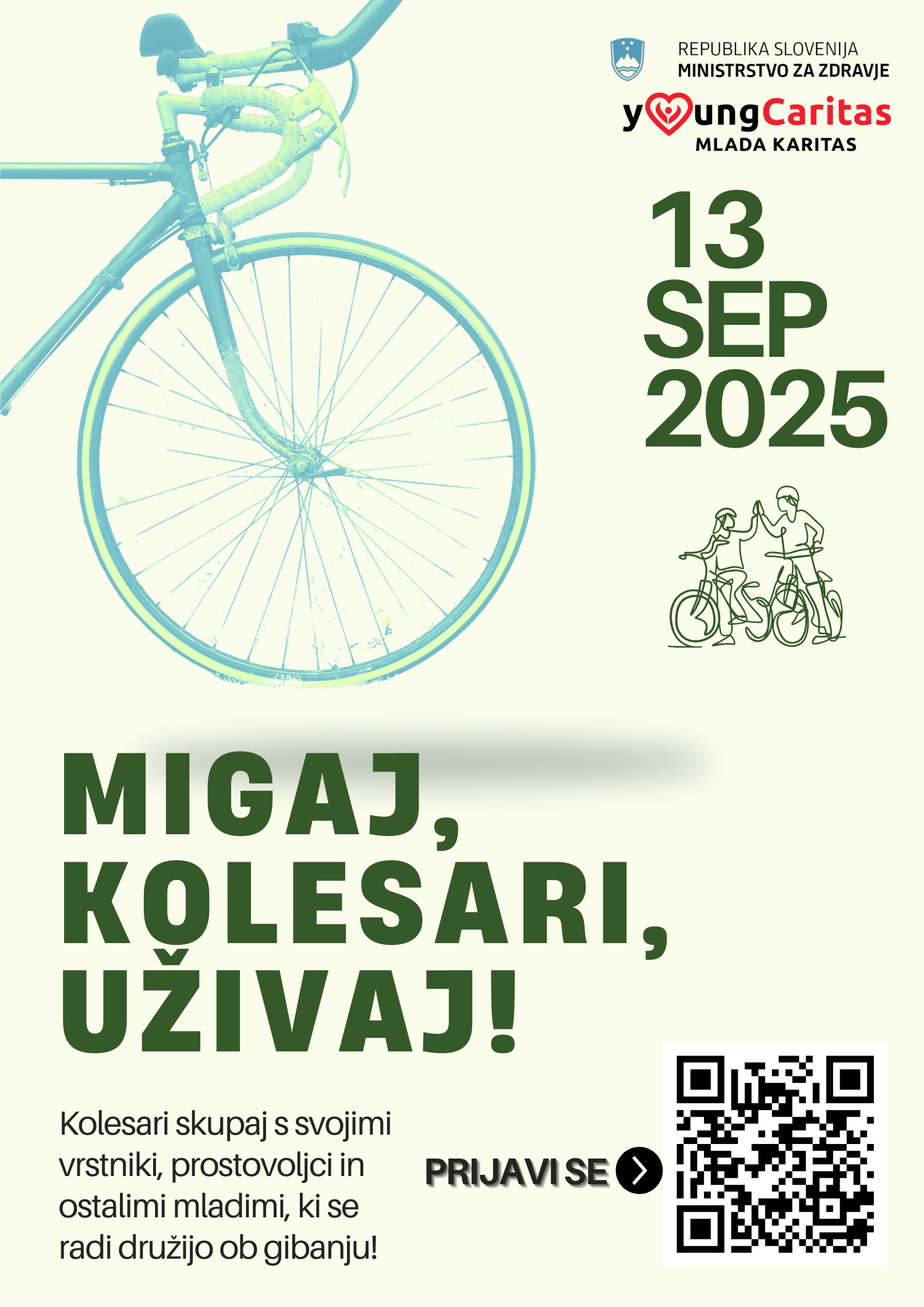 Škofijska Karitas Celje vabi vse mlade, da se nam pridružite na posebnem dogodku v okviru projekta ministerstva za zdravje »Migaj, zdravo uživaj«, ki bo potekal v soboto, 13. septembra 2025. Dogodek ni tekmovanje, temveč priložnost za sproščeno vožnjo, druženje in aktivno preživljanje prostega časa v naravi. Skupaj želimo ustvariti lepo izkušnjo povezovanja, gibanja in veselja. Kako
